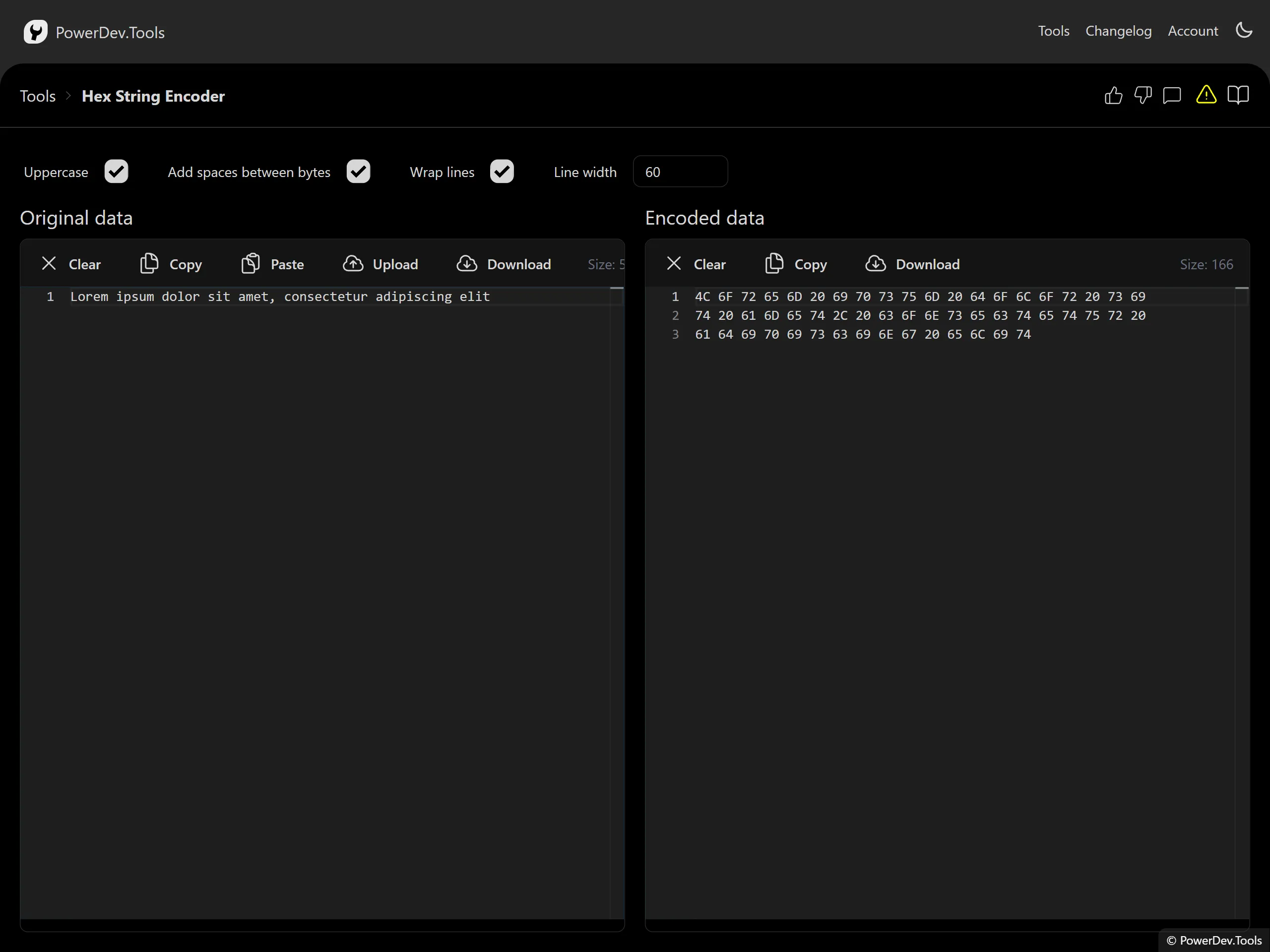 Hex encoding is commonly used in debugging, network protocol analysis, low-level programming, and data inspection. It is straightforward but verbose — each input byte becomes two output characters, resulting in a 2× size increase.